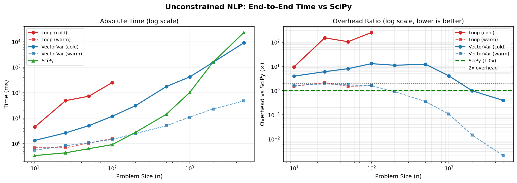 Key Insight: Cold solves include one-time compilation. Warm solves (repeated optimization with cached structure) achieve near-parity or better than raw SciPy.